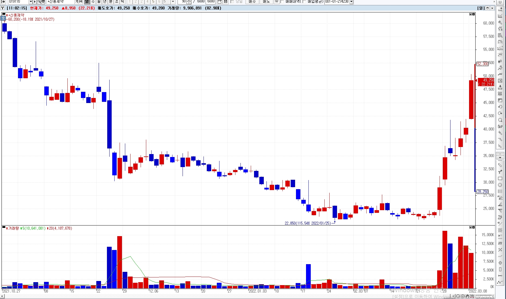 이미지 확대보기8일 한국거래소에 따르면 신풍제약 주가는 지난달 45.19% 급등한데 이어, 이달에도 40% 넘는 월간 주가 상승률을 기록하고 있다.
