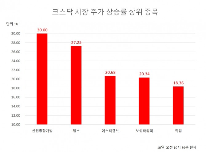 10일 오전 10시 39분 현재 코스닥시장 주가 상승률 상위 30개 종목은 다음과 같다.