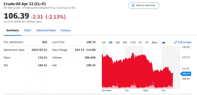 이미지 확대보기11일 뉴욕증시와 뉴욕상업거래소에 따르면 4월물 서부텍사스산원유(WTI) 가격은 2.5%) 하락한 배럴당 106.02달러에 거래를 마쳤다. 이 종가는 지난 3월 1일 이후 가장 낮은 수준이다. 아랍에미리트(UAE)의 오락가락 행보 속에 급등했다가 다시 하락하는 등 변동성이 높은 모습을 보였다. 그 바람에 뉴욕증시와 비트코인도 흔들거렸다. WTI 가격은 장 초반 한때 5% 이상 올랐다.