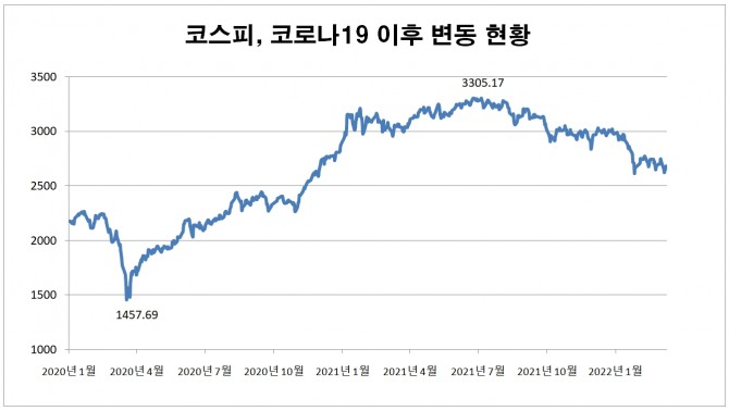 지난 2020년 3월 19일 코스피는 1500선이 붕괴되는 공포를 경험했지만 극적인 반등에 성공하며 2021년 7월에는 3300까지 오르는 강세장이 펼쳐졌다. 이후 인플레이션 우려와 지정학적 리스크까지 겹치면서 현재는 2600선으로 후퇴한 상황이다.