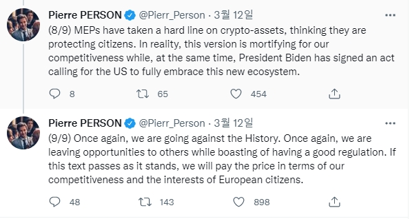 이미지 확대보기프랑스 파리 국회의원이자 법률 위원회 위원인 피에르 페르손(Pierre Person)은 트위터를 통해 새로 추가된 언어를 비난했다. 그는 트위터에서 이러한 규제가 성장하는 암호화폐 생태계에서 유럽의 경쟁력에 미칠 영향을 언급했다.