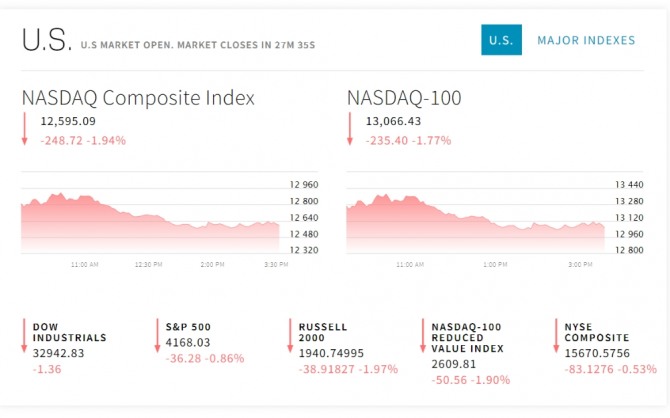 이미지 확대보기15일 미국 뉴욕증시는 러시아와 우크라이나 간의 4차 협상, 이번 주 예정된 연방공개시장위원회(FOMC) 정례회의 등을 주시하며 혼조세로 출발했다. 뉴욕증권거래소(NYSE)에서 다우존스30산업평균지수는 오르고 스탠더드앤드푸어스(S&P)500지수와 기술주 중심의 나스닥 지수는 하락 상태로 출발했다. 시간이 흐르면서 다우존스30산업평균지수와 스탠더드앤드푸어스(S&P)500지수 그리고 기술주 중심의 나스닥 지수 모두 큰폭의 하락세를 보이고 있다. FOMC의 금리인상 공포도 뉴욕증시에 부담이 되고 있다. 미국 10년물 국채금리는 인플레이션 우려와 연준의 긴축 가능성에 2%를 돌파했다.러시아의 디폴트도 다가오고 있다.