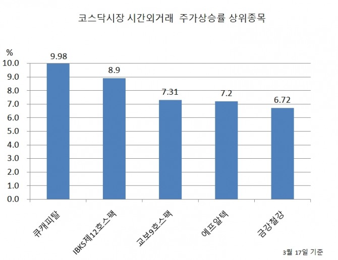 이미지 확대보기18일 한국거래소에 따르면 큐캐피탈은 지난 17일 장 마감후 이어진 시간외거래에서 9.98% 상승해 시간외거래 상승률 1위를 기록했다.