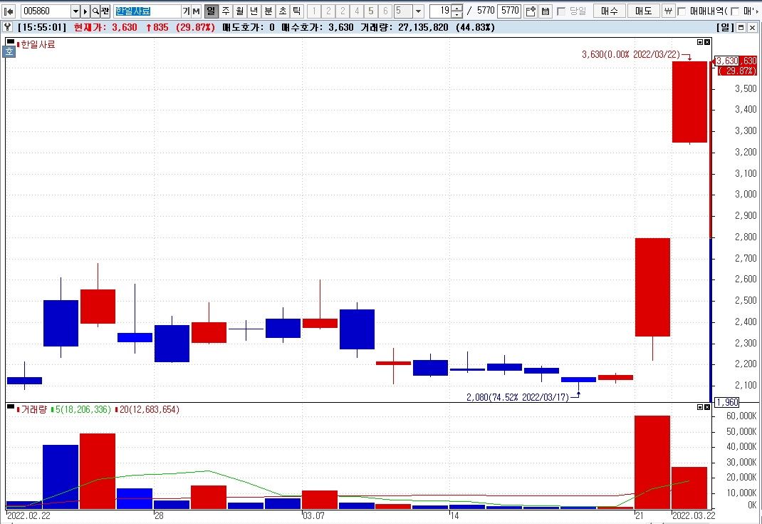 이미지 확대보기22일 한국거래소에 따르면 이날 코스닥 시장에서 한일사료와 현대사료가 이틀 연속 동반 상한가를 기록했다.