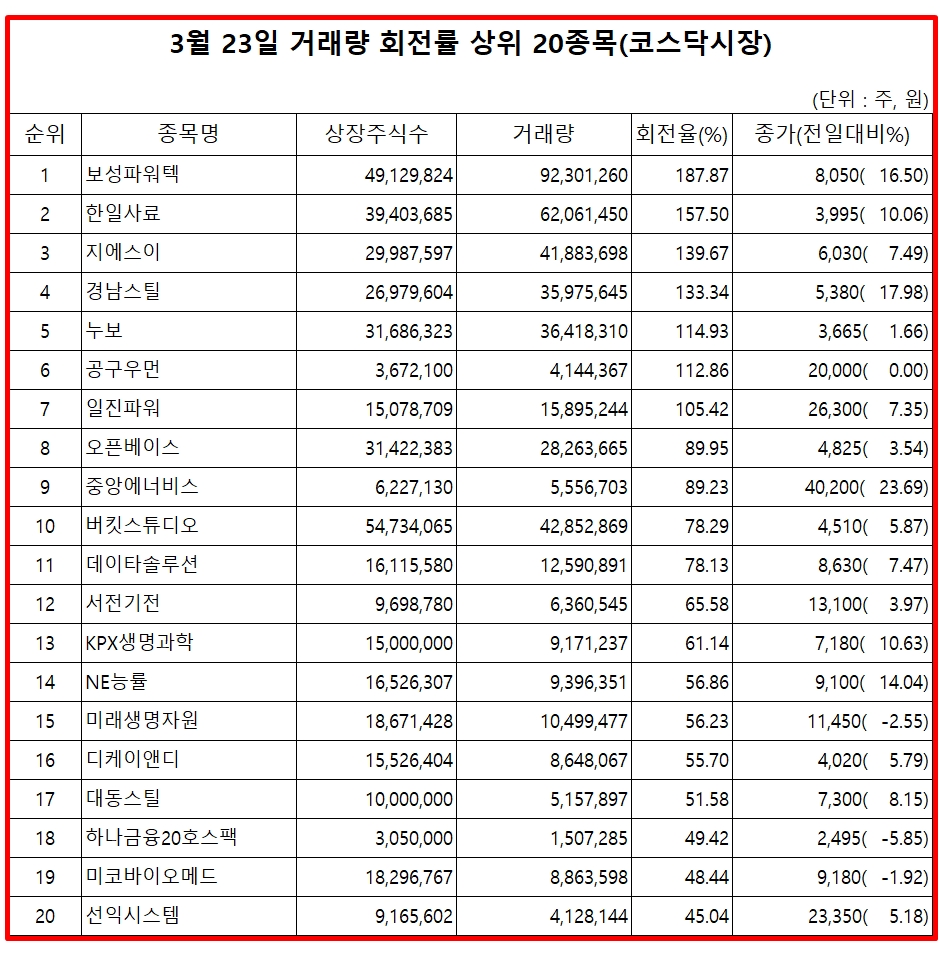 23일 주식시장에서 코스닥 종목 거래량 회전률 상위 종목은 다음과 같다.
