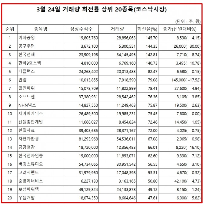 표기순서는 순위, 종목명, 거래량 회전률, 24일 종가, 주가 등락률 순이다.