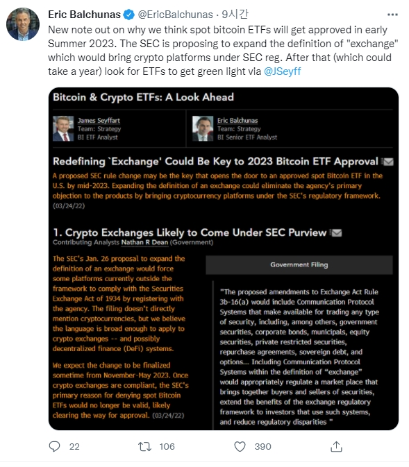 이미지 확대보기암호화폐 분석가 에릭 발추나스와 제임스 세이파트는 SEC가 제안한 규칙 변경이 감독기관이 2023년 중반에 비트코인 ETF를 승인하는 촉매제가 될 수 있다고 말했다.