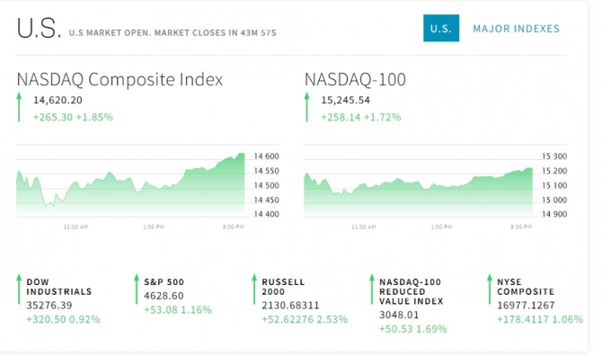이미지 확대보기30일 뉴욕증권거래소(NYSE)에 따르면 다우존스30산업평균지수와 스탠더드앤드푸어스(S&P)500지수 그리고 기술주 중심의 나스닥 지수 모두 오르고 있다. 뉴욕증시에서는 러시아와 우크라이나 간의 긴장 완화 소식과 국채금리 하락 그리고 국제유가 안정등이 주목받고 있다.