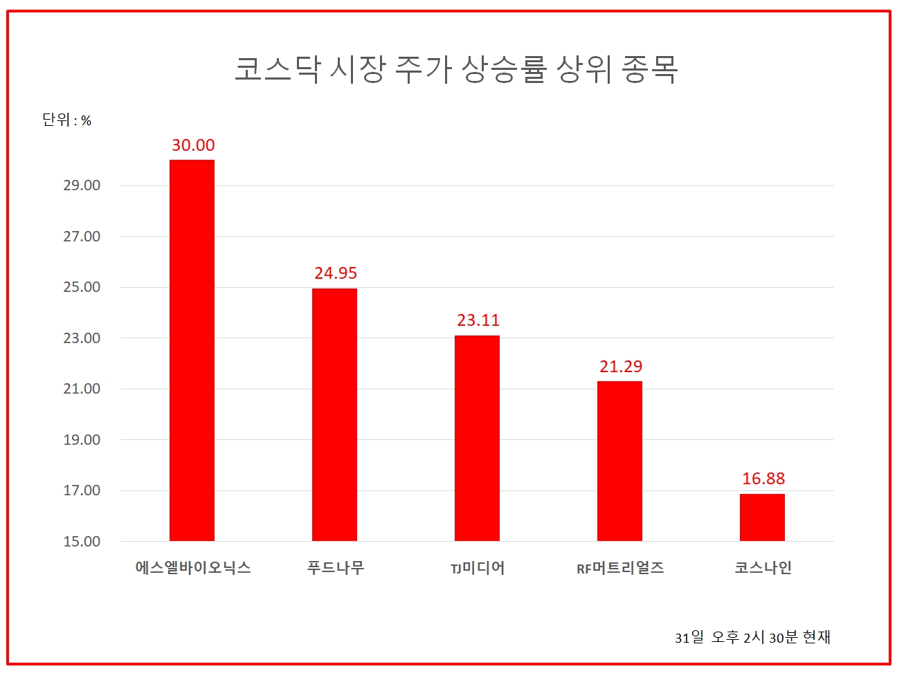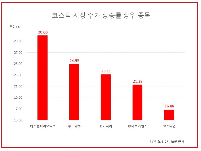 21위 에이비프로바이오 840원 (8.53%), 22위 테고사이언스 19800원 (8.2%), 23위 씨티씨바이오 10100원 (8.37%), 24위 대동스틸 7040원 (7.48%), 25위 이루온 2500원 (7.3%), 26위 제주맥주 3395원 (7.44%), 27위 유앤아이 11850원 (6.76%), 28위 알에프텍 6100원 (7.21%), 29위 지에스이 5290원 (7.19%), 30위 씨에스베어링 19400원 (7.18%)
