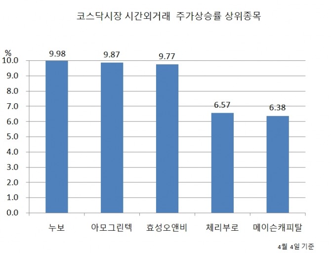 표기 순서는 상승률 순위, 종목명, 4일 시간외 종가, 시간외거래 주가 상승률 순이다.