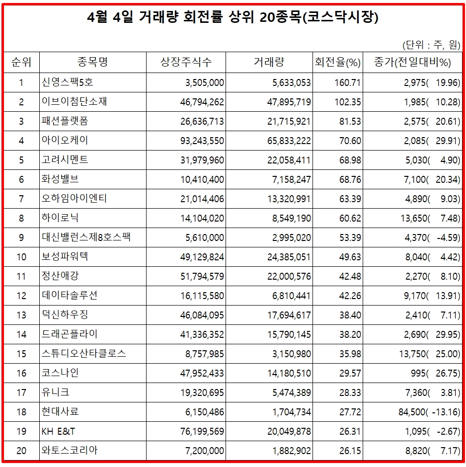 4일 코스닥 시장에서 거래량 회전률 상위 종목은 다음과 같다.