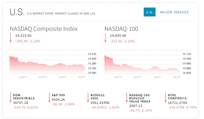 이미지 확대보기6일 뉴욕증권거래소(NYSE)에 따르면 다우존스30산업평균지수와 스탠더드앤드푸어스(S&P)500지수 그리고 기술주 중심의 나스닥 지수 모두 떨어지고 있다. 서방의 대러시아 제재와 국채 수익률 역전에 따른 경기 침체 우려 그리고 연방공개시장위원회(FOMC) 의사록 등이 이슈이다.