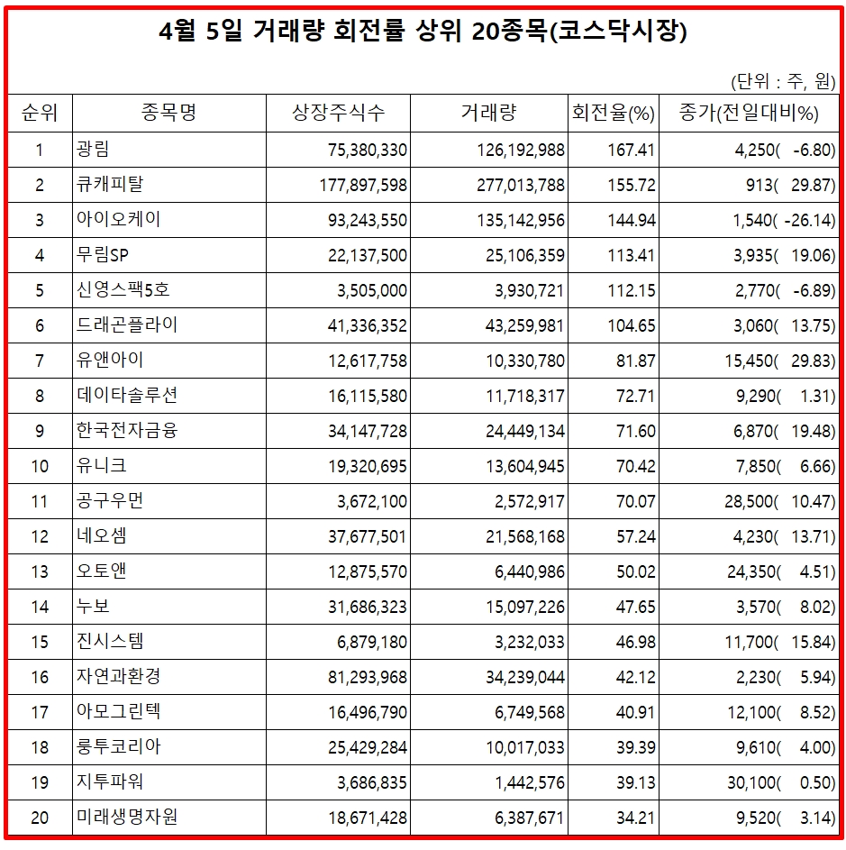 5일 주식시장에서 코스닥 종목의 거래량 회전률 상위 종목은 다음과 같다.