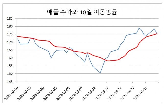 이날 애플은 주가는 10일 이동평균 주가 175.4달러를 아래로 내려왔다.