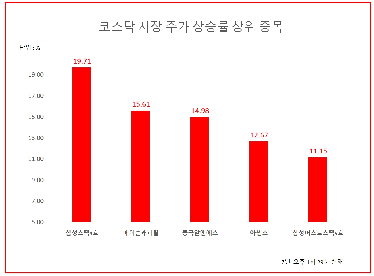 11위 해성산업1우 19850원 (9.67%), 12위 화성밸브 8140원 (7.39%), 13위 ISC 30600원 (7.18%), 14위 WI 1500원 (6.76%), 15위 KG ETS 16900원 (6.96%), 16위 스킨앤스킨 466원 (5.91%), 17위 라온테크 46700원 (6.14%), 18위 아비코전자 11300원 (5.61%), 19위 스페코 7350원 (5.45%), 20위 에치에프알 38750원 (5.3%)