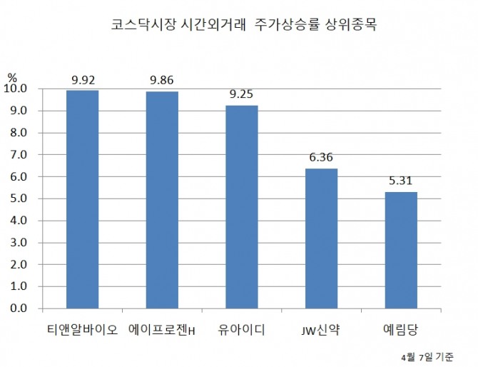 다음은 지난 7일 코스닥 시장 시간외거래 주가상승률 상위 종목이다.