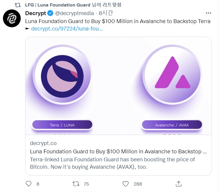 이 매체에 따르면 테라(Terra) 블록체인을 지원하는 비영리 단체인 LFG는 암호화폐 준비금을 다변화하기 위해 1억 달러 상당의 아발란체(AVAX) 토큰을 구매했다.
