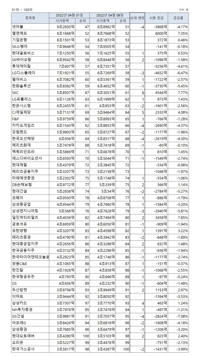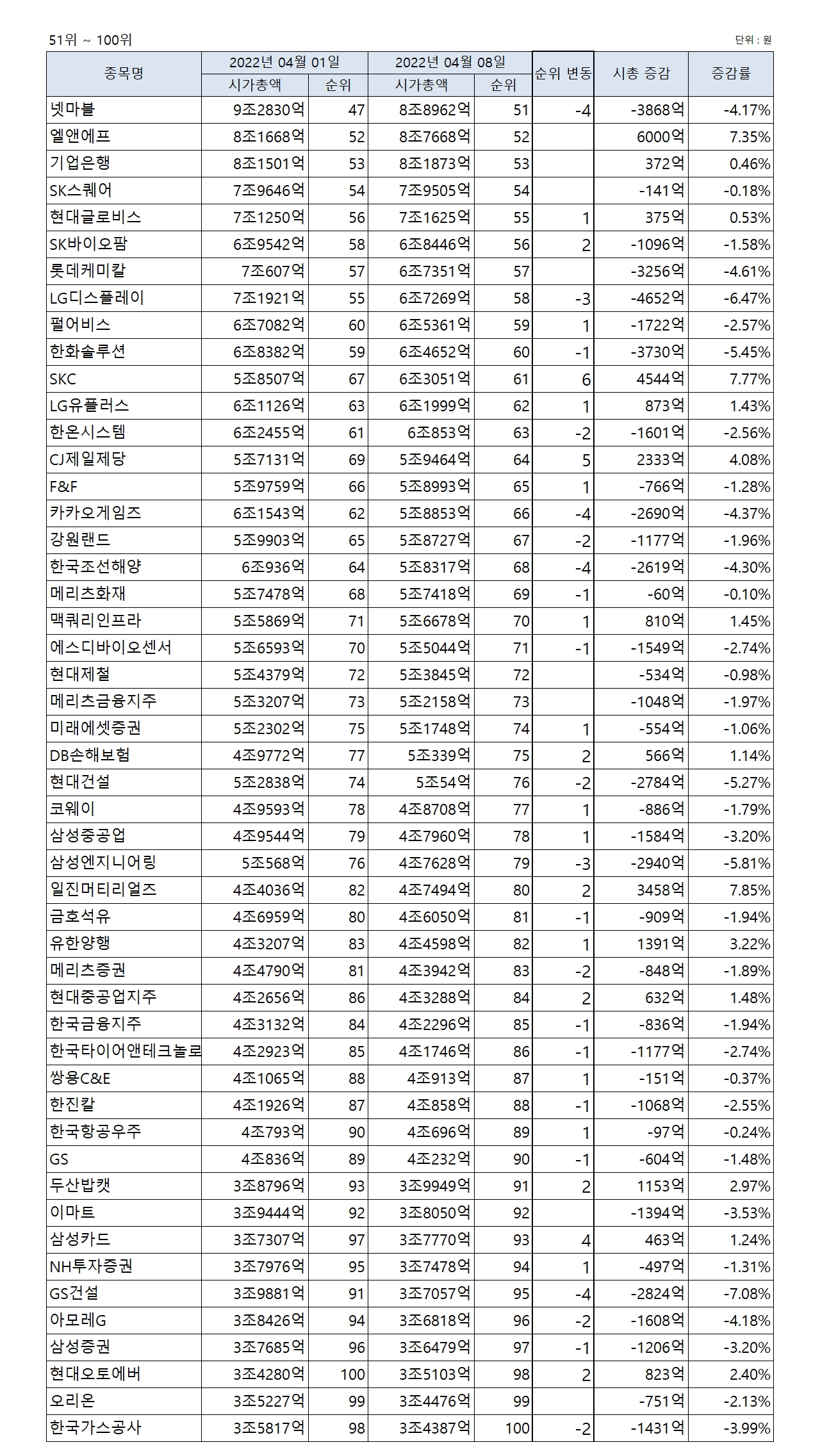 [표2] 시가총액 상위 41위 ~ 100위 주간 주가 동향