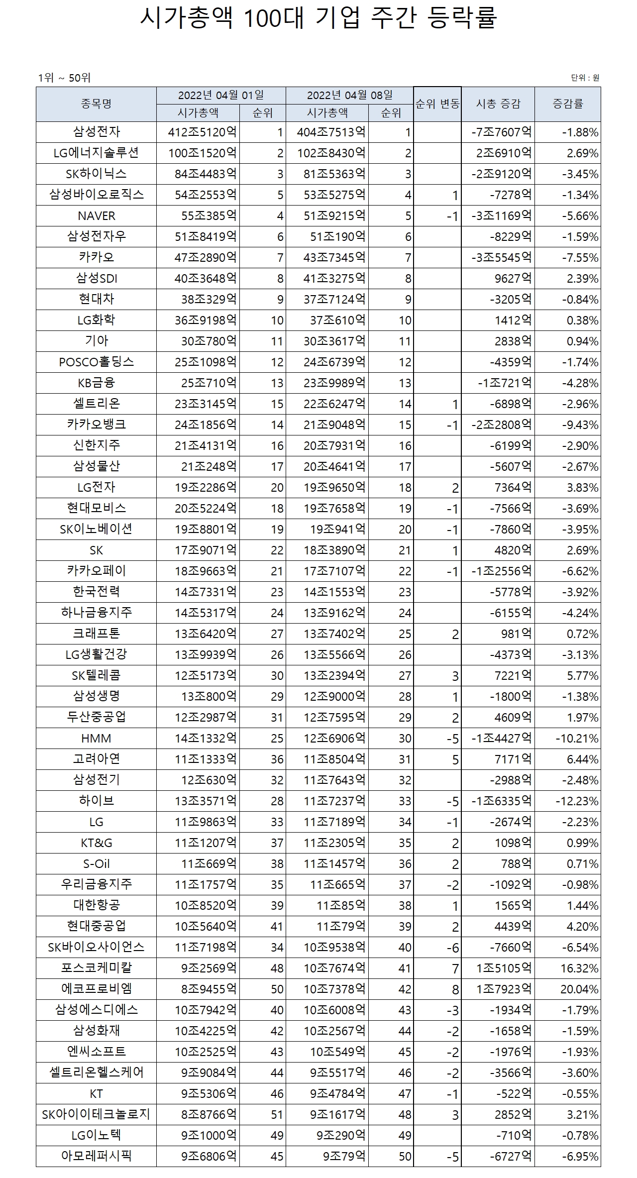 [표1] 시가총액 상위 1위 ~ 50위 주간 주가 동향