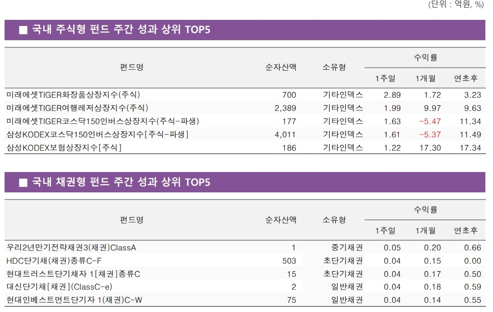 국내 주식형 펀드의 성과를 살피면 순자산액(클래스 합산) 100억 원 이상, 운용 기간 1개월 이상인 펀드 3680개 중 79개가 일주일 간 플러스 수익률을 보였다. 코스피 지수 등락률을 상회한 펀드는 1429개 였으며 '미래에셋TIGER화장품상장지수(주식)' 펀드가 2.89%의 수익률로 국내주식형 펀드 중 최고 성과를 보였다.