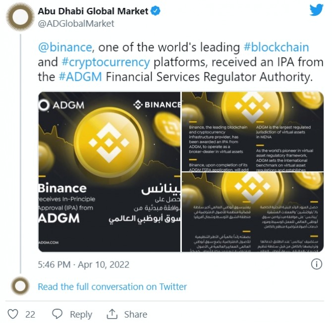 암호화폐 거래소인 바이낸스가 10일 아부다비 글로벌 마켓(ADGM)의 원칙적 승인을 받았다. 사진=트위터
