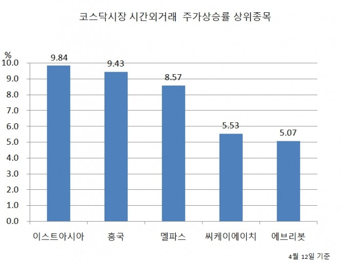 다음은 지난 12일 코스닥 시장 시간외거래 주가상승률 상위 종목이다.