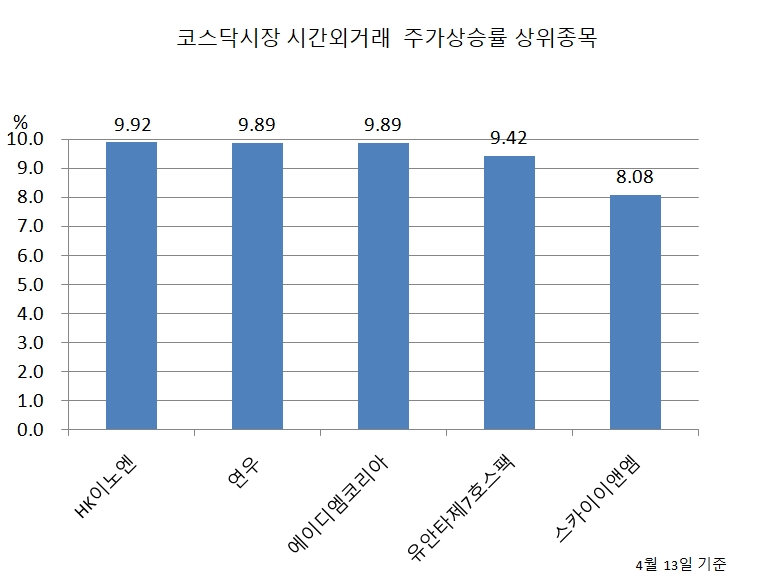 다음은 지난 13일 코스닥 시장 시간외거래 주가상승률 상위 종목이다.