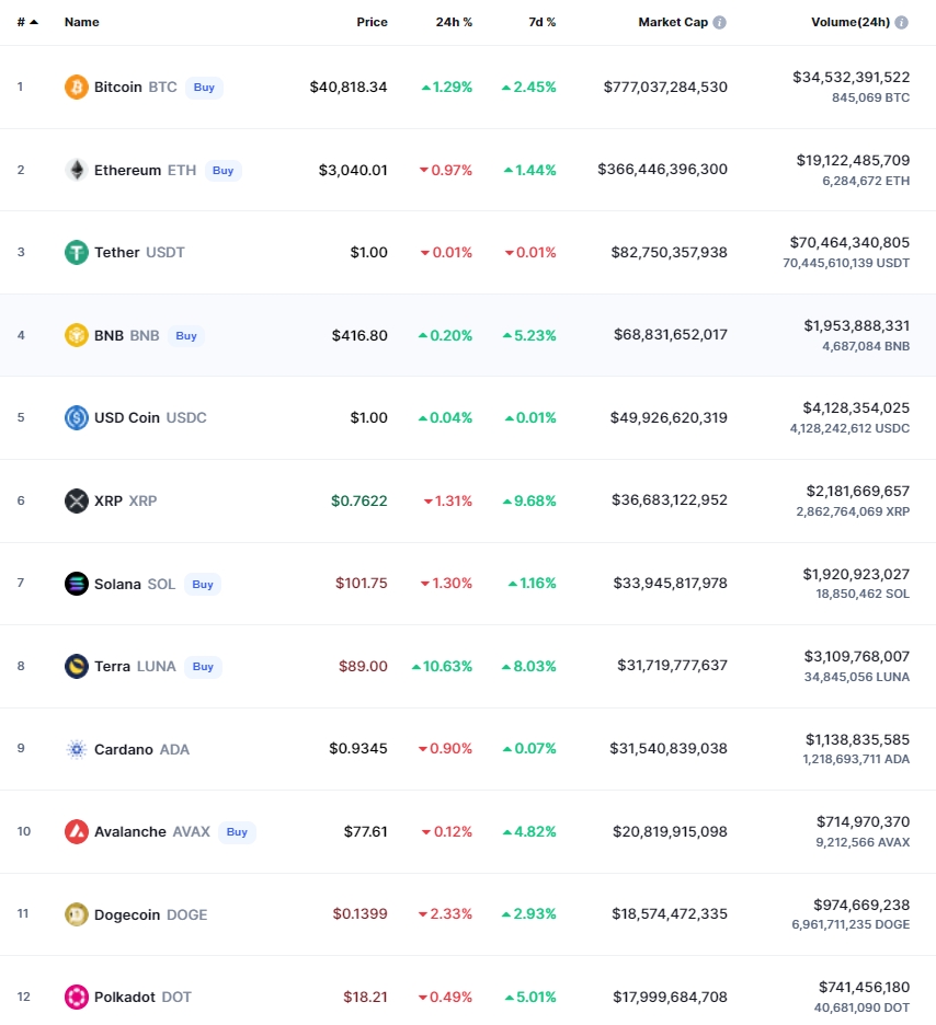테라(LUNA)는 10.63% 폭등해 89달러가 됐다. 테라의 루나 코인 시가총액은 317억달러로 하루 만에 카르다노의 에이다를 누르고 8위로 한 단계 뛰어 올랐다. 업비트에서는 테라의 루나 코인 원화 거래가 지원되지 않는다.