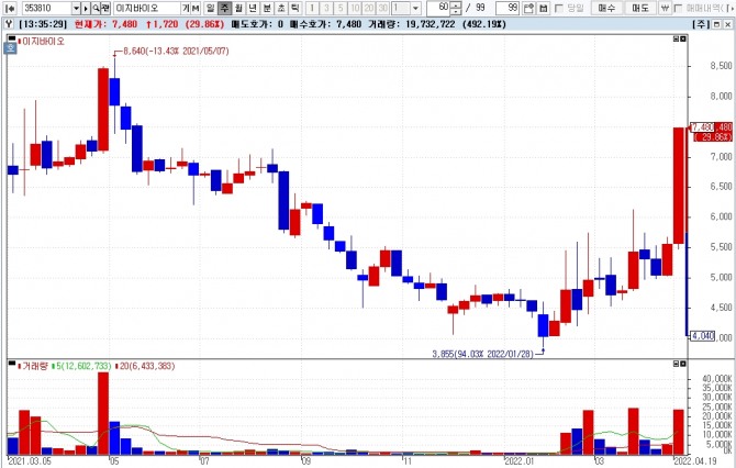 이지바이오의 지주회사인 이지홀딩스도 18.45% 상승하며 동반 강세를 보이고 있다.