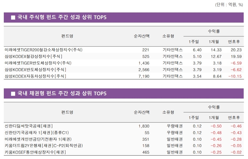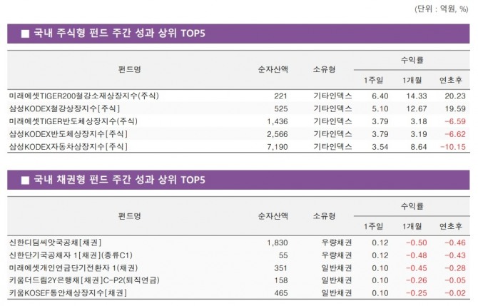 국내 주식형 펀드의 성과를 살펴보면 순자산액(클래스 합산) 100억원 이상, 운용 기간 1개월 이상인 펀드 3694개 중 1924개가 일주일 간 플러스 수익률을 보였다. 코스피 지수 등락률을 상회한 펀드는 1430개였으며 '미래에셋TIGER200철강소재상장지수(주식)' 펀드가 6.40%의 수익률로 국내주식형 펀드 중 최고 성과를 나타냈다.
