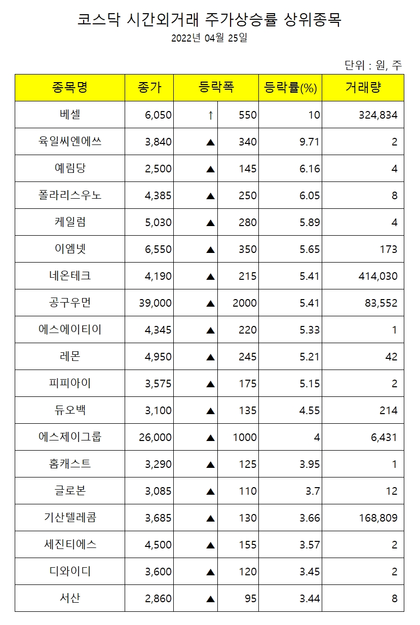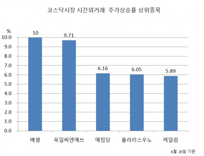 26일 한국거래소에 따르면 베셀은 전날 장 마감후 이어진 시간외거래에서 10% 상승한 6050원에 거래를 마쳤다.