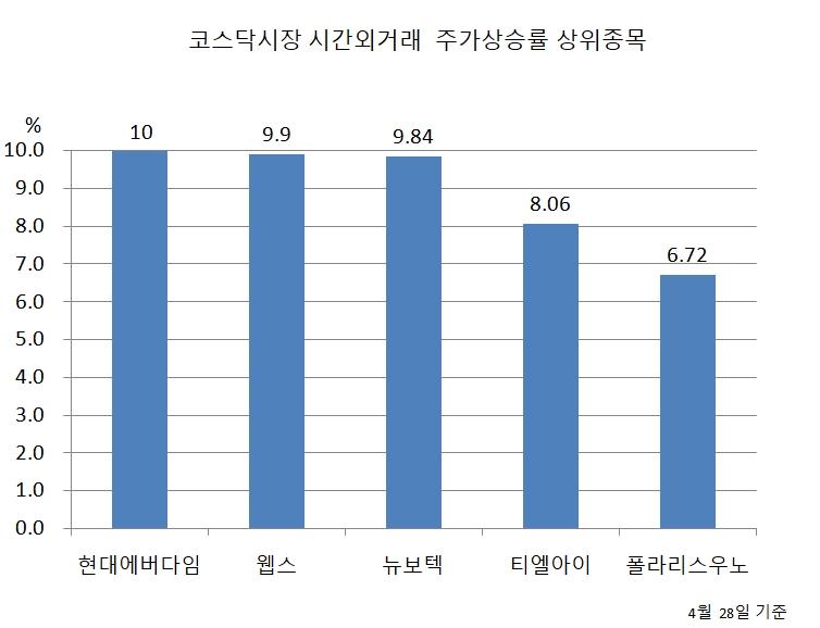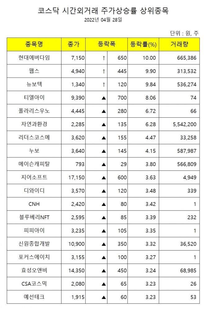 다음은 지난 28일 코스닥 시장 시간외거래 주가상승률 상위 종목이다.