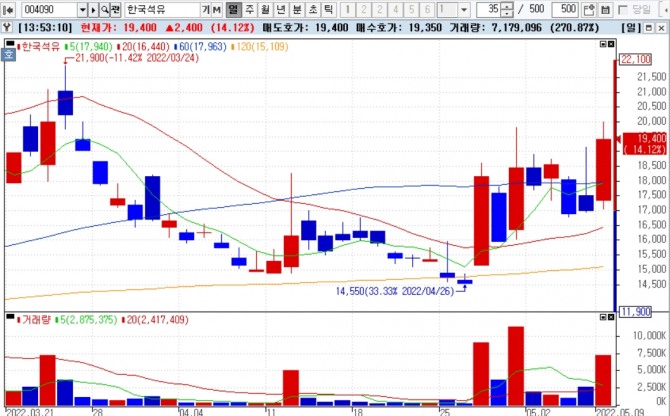 이미지 확대보기9일 한국거래소에 따르면 한국석유는 이날 오후 1시48분 현재 전거래일 대비 16.46% 급등한 1만9800원에 거래되고 있다.