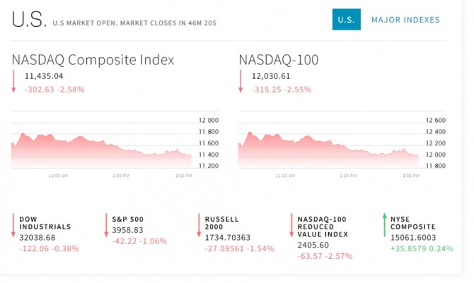 이미지 확대보기12일 뉴욕증시에 따르면 4월 소비자물가지수 상승률이 전달보다 둔화했다는 소식에 뉴욕 증권거래소(NYSE)에서 다우존스30산업평균지수와 스탠더드앤드푸어스(S&P)500지수 그리고 기술주 중심의 나스닥 지수기 혼조 출발했으나 국채금리가 오르면서 하락하고 있다.