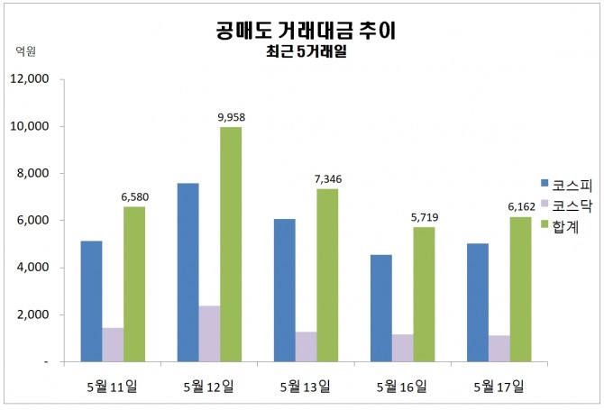 이미지 확대보기18일 한국거래소에 따르면 지난 17일 주식시장에서 공매도 거래대금 규모는 6162억원을 기록해 전 거래일 보다 442억원 늘어났다.