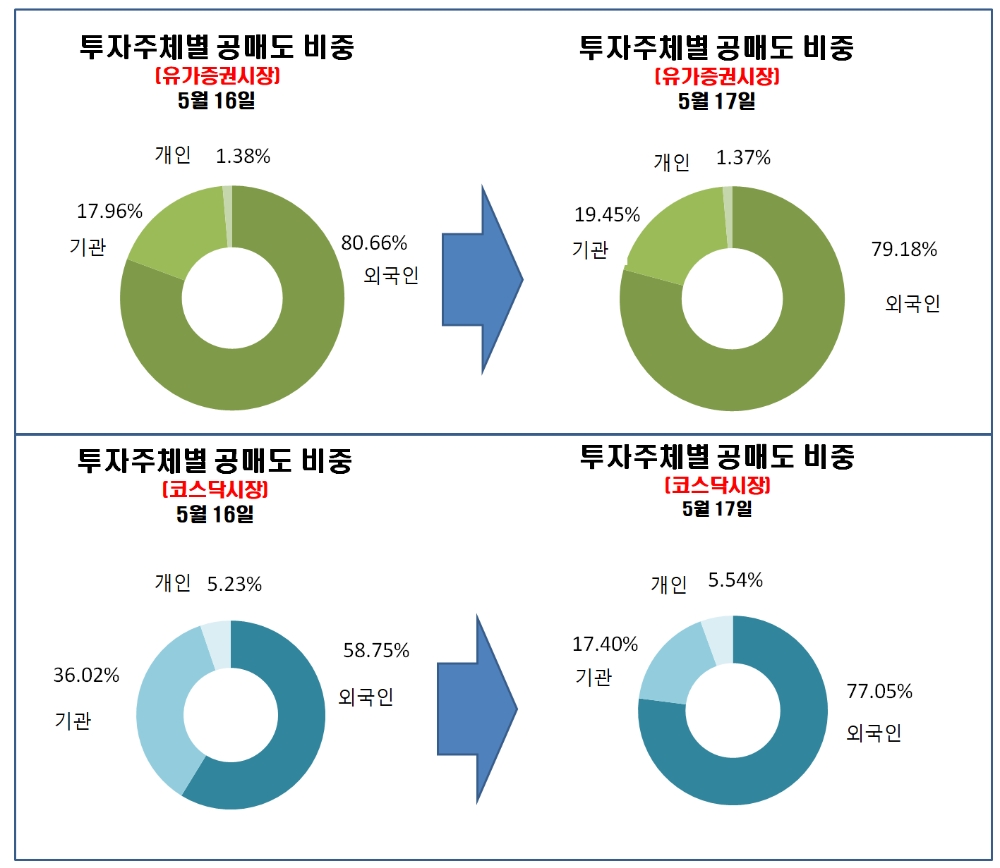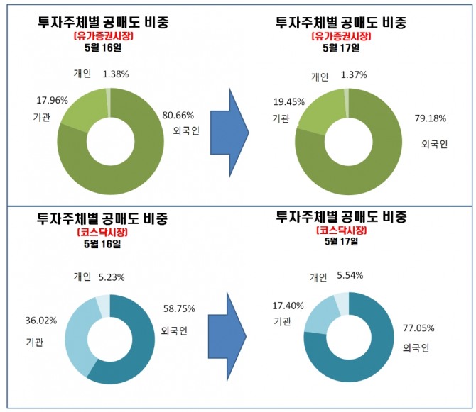 코스닥시장에서는 기관이 36.02%에서 17.40%으로 크게 줄었으며, 외국인은 58.75%에서 77.05%로 늘어났다.