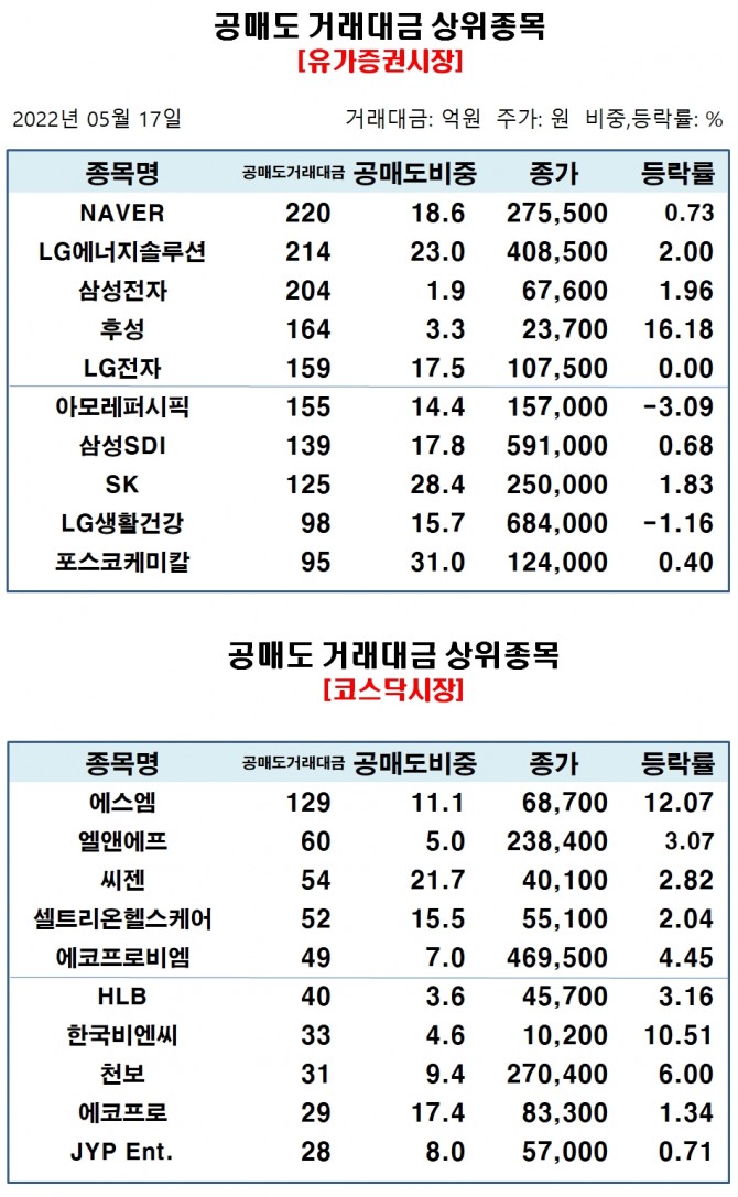 유가증권시장에서 공매도 거래대금 상위종목은 NAVER 220억원, LG에너지솔루션 214억원, 삼성전자 204억원, 후성 164억원, LG전자 159억원, 아모레퍼시픽 155억원, 삼성SDI 139억원, SK 125억원, LG생활건강 98억원, 포스코케미칼 95억원을 각각 기록했다.
