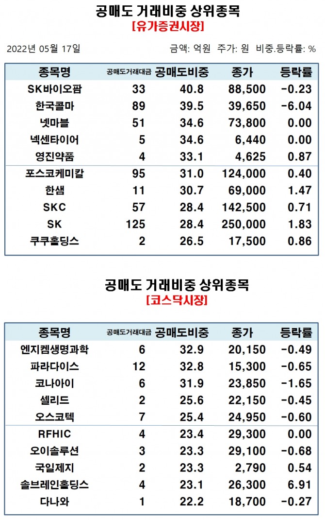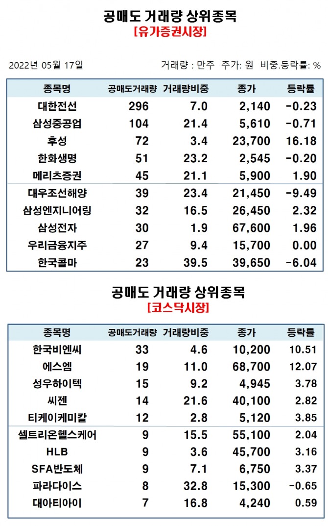유가증권시장 공매도 거랴량 상위종목은 대한전선 296만주, 삼성중공업 104만주, 후성 72만주, 한화생명 51만주, 메리츠증권 45만주, 대우조선해양 39만주, 삼성엔지니어링 32만주, 삼성전자 30만주, 우리금융지주 27만주, 한국콜마 23만주 순이다.