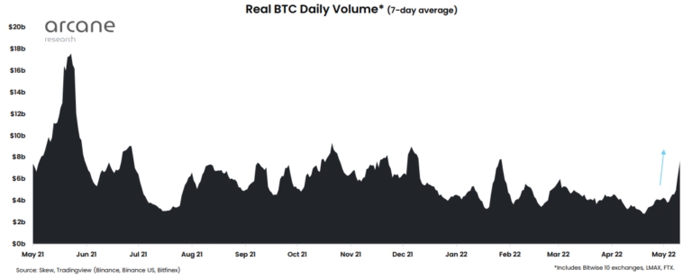 지난주 테라의 스테이블코인 UST와 루나(LUNA) 코인 붕괴로 인한 암호화폐 시장의 몰락이 현물 거래량의 급격한 증가의 주요 원인이다.