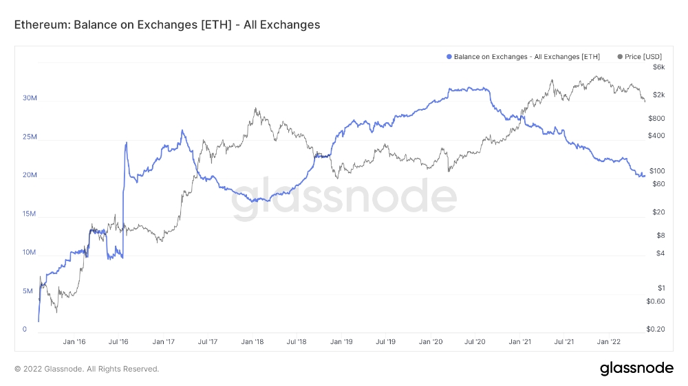 이미지 확대보기그런데도 블록체인 분석기업 글래스노드(Glassnode)가 추적한 온체인 데이터에 따르면 거래소가 보유한 ETH의 수는 5월에도 계속 감소했다.