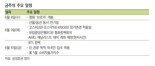 6월 FOMC(14~15일)을 앞두고 연준 위원들의 공개 발언을 금지 하는 블랙아웃 기간에 들어가기 때문에 이번 주의 경우 특별한 매크로 이슈도 없다.
