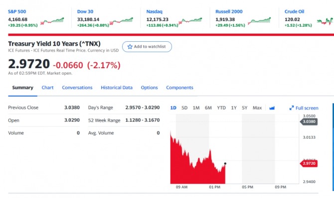 이날 뉴욕증시에서는 세계은행이 글로벌 스태그플레이션(고물가·저성장) 위험을 경고하고 나섰다는 소식도 나왔다. 세계은행은 올해 글로벌 성장률을 2.9%로 하향했다. 지난 1월 전망치인 4.1%에서 대폭 하향 조정한 것이다. 데이비드 맬패스 세계은행 총재는 "몇 년 동안 평균 이상의 인플레이션과 평균 이하의 성장률이 나타날 가능성이 있는 것 같다"라며 "스태그플레이션 위험이 상당하다"라고 말했다.