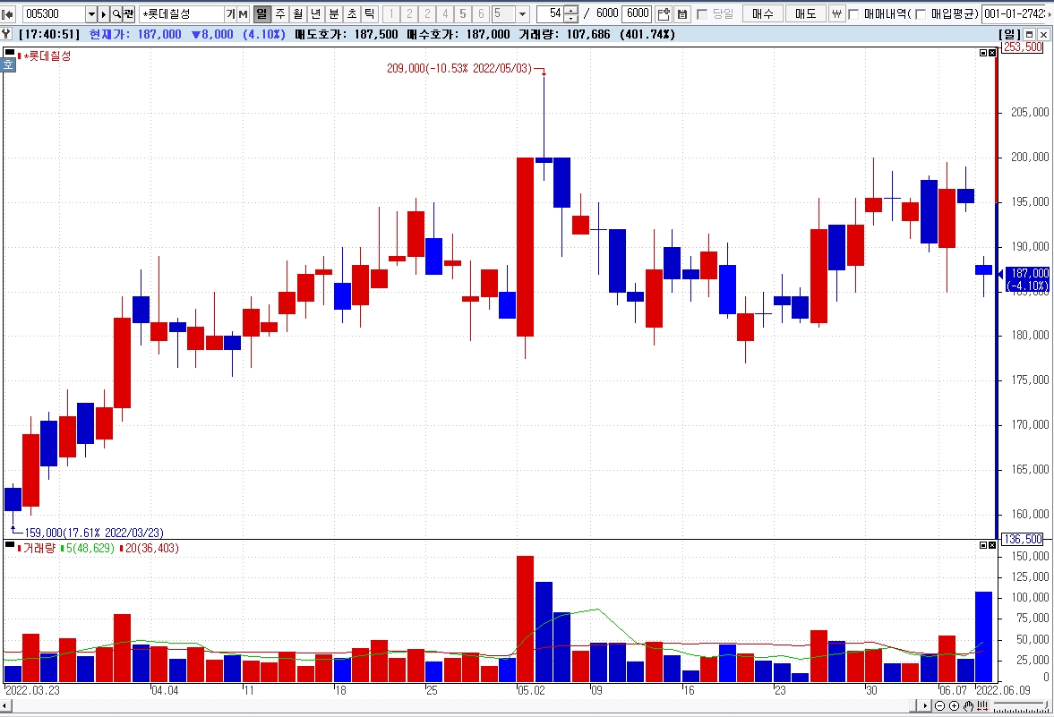 9일 한국거래소에 따르면 이날 유가증권시장에서 롯데칠성은 전 거래일 대비 4.10% 내린 18만7000원에 거래를 마감했다.