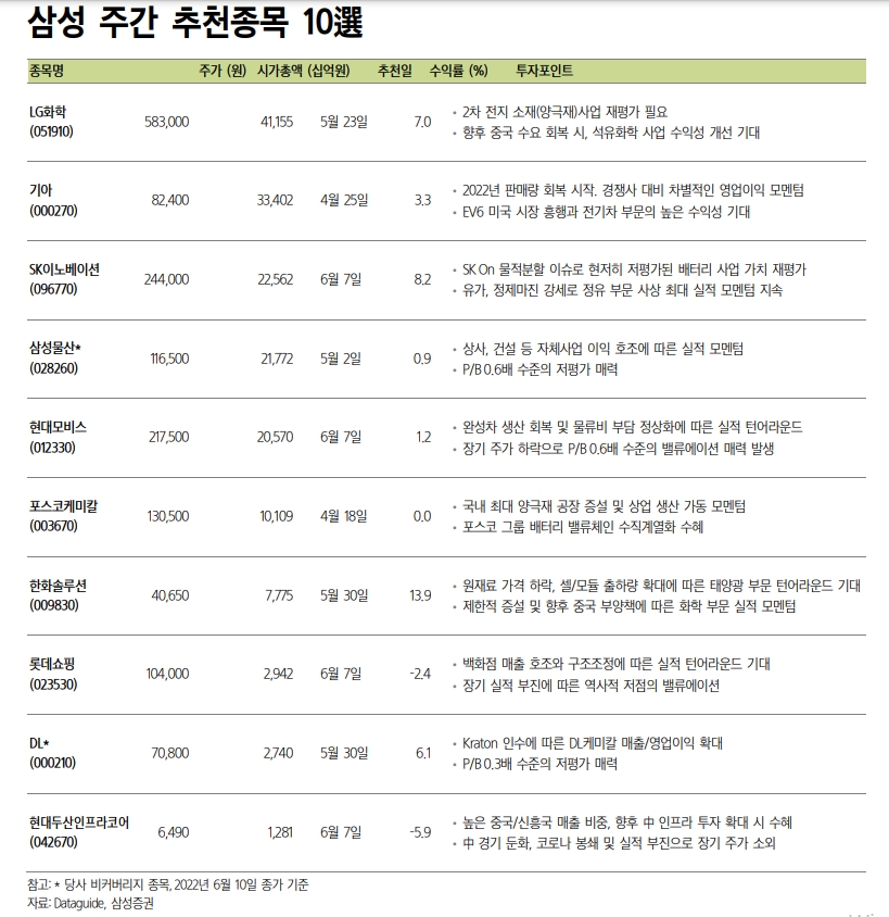 삼성증권은 이번주 투자 전략과 관련해서도 밸류에이션 저평가 기업과 자동차·2차전지 관련주에 주목했다.