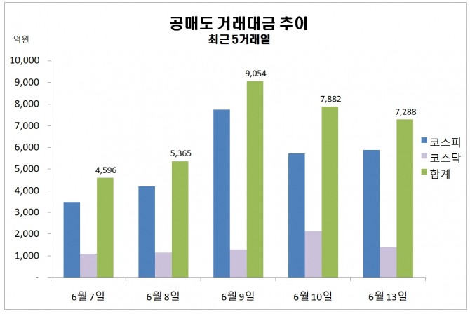 이미지 확대보기14일 한국거래소에 따르면 지난 13일 주식시장에서 공매도 거래대금 규모는 7288억원을 기록했다.
