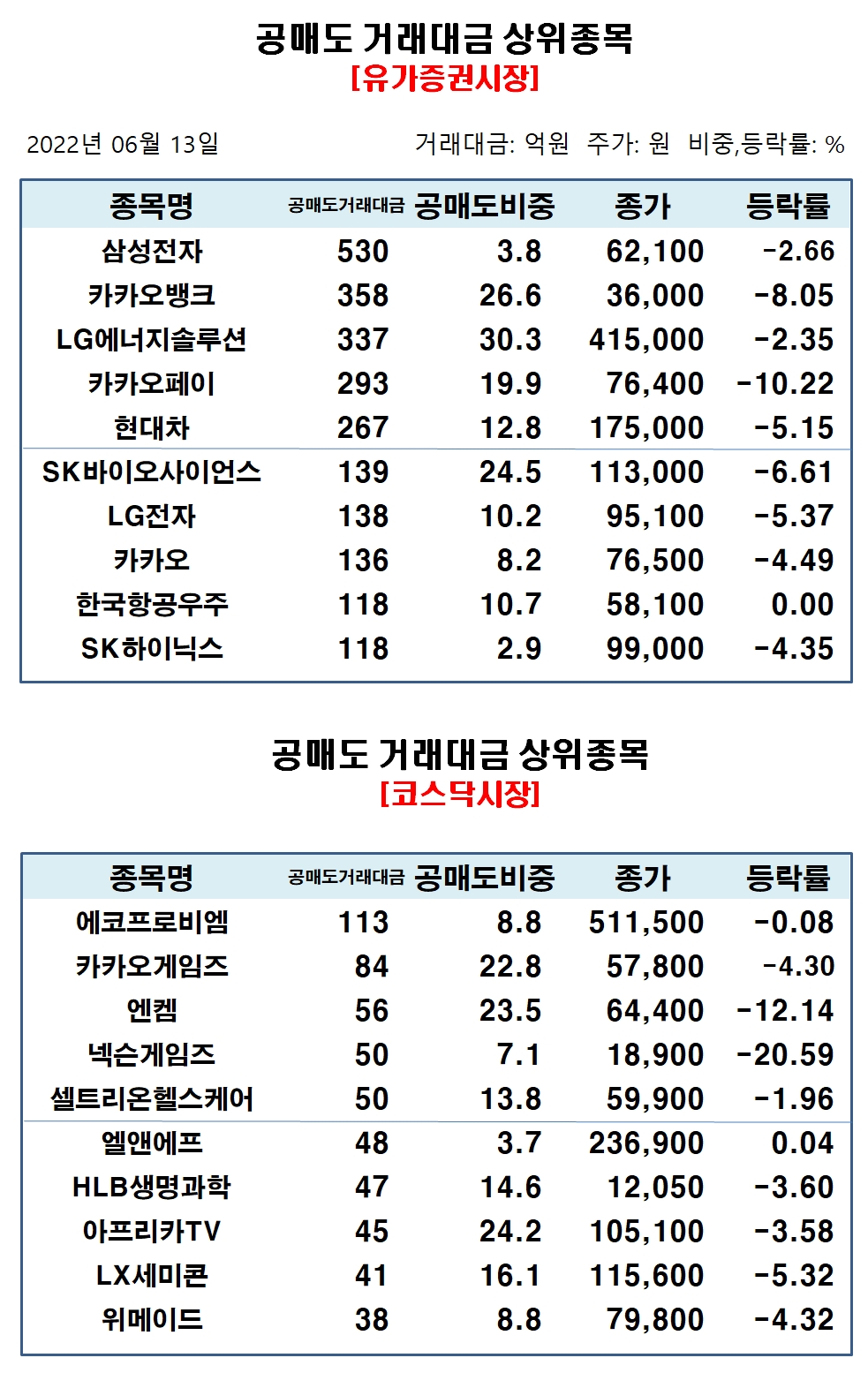 코스닥시장에서 공매도 거래대금 상위종목은 에코프로비엠 113억원, 카카오게임즈 84억원, 엔켐 56억원, 넥슨게임즈 50억원, 셀트리온헬스케어 50억원, 엘앤에프 48억원, HLB생명과학 47억원, 아프리카TV 45억원, LX세미콘 41억원,