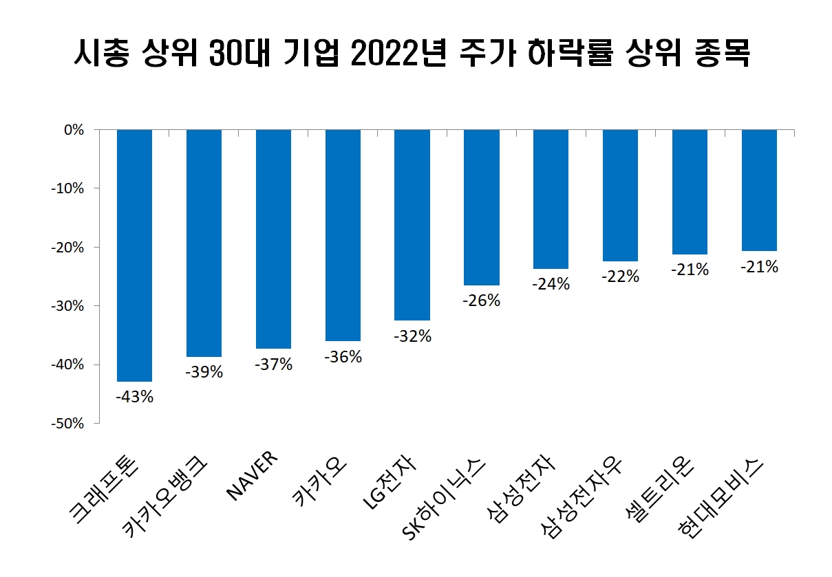 21일 한국거래소에 따르면 한 때 '10만전자'를 꿈꾸던 삼성전자는 '5만전자'에 머물러 있다. 네이버와 카카오 등 플랫폼 종목들도 연초 대비 30% 이상 추락했다. 올해 주식시장에서 시가총액이 가장 큰 폭으로 줄어든 종목은 단연 삼성전자다. 삼성전자는 올해에만 24% 하락하면서 부진한 양상이 두드러진다. 지난주 삼성전자는 연일 신저가를 기록하며 결국 강력한 지지 마지노선인 '6만전자'마저 속수무책으로 무너졌다. 삼성전자 주가가 다시 5만원대를 기록한 것은 지난 2020년 11월 이후 처음이다.