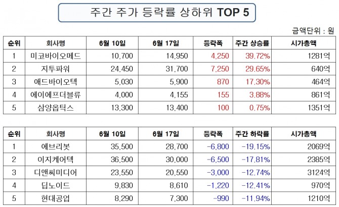 1위 미코바이오메드 1만4950원 4250원(39.72%), 2위 지투파워 3만1700원 7250원(29.65%), 3위 애드바이오텍 5900원 870원(17.3%), 4위 에이에프더블류 4155원 155원(3.88%), 5위 삼양옵틱스 1만3400원 100원(0.75%)