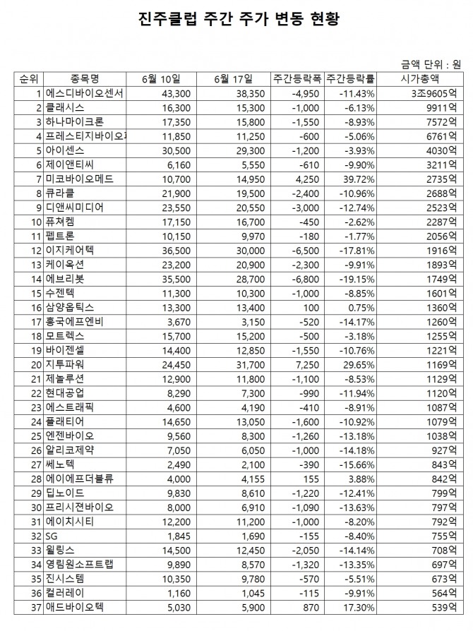 주간기준 진주클럽 구성종목 중 하락률 상위 종목은 다음과 같다.