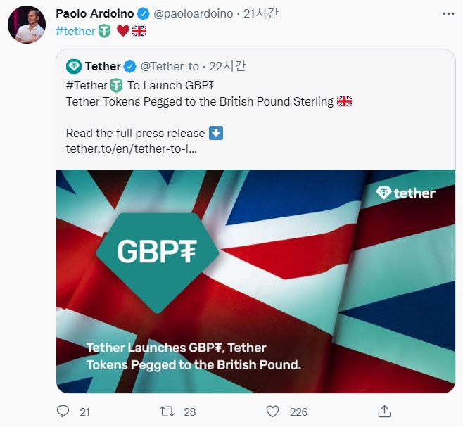 테더 최고 재무책임자(CTO) 파올로 아르도이노(Paolo Ardoino)는 성명에서 "영국이 블록체인 혁신과 금융 시장을 위한 암호화폐의 광범위한 구현을 위한 다음 개척지라고 믿는다"고 밝혔다.